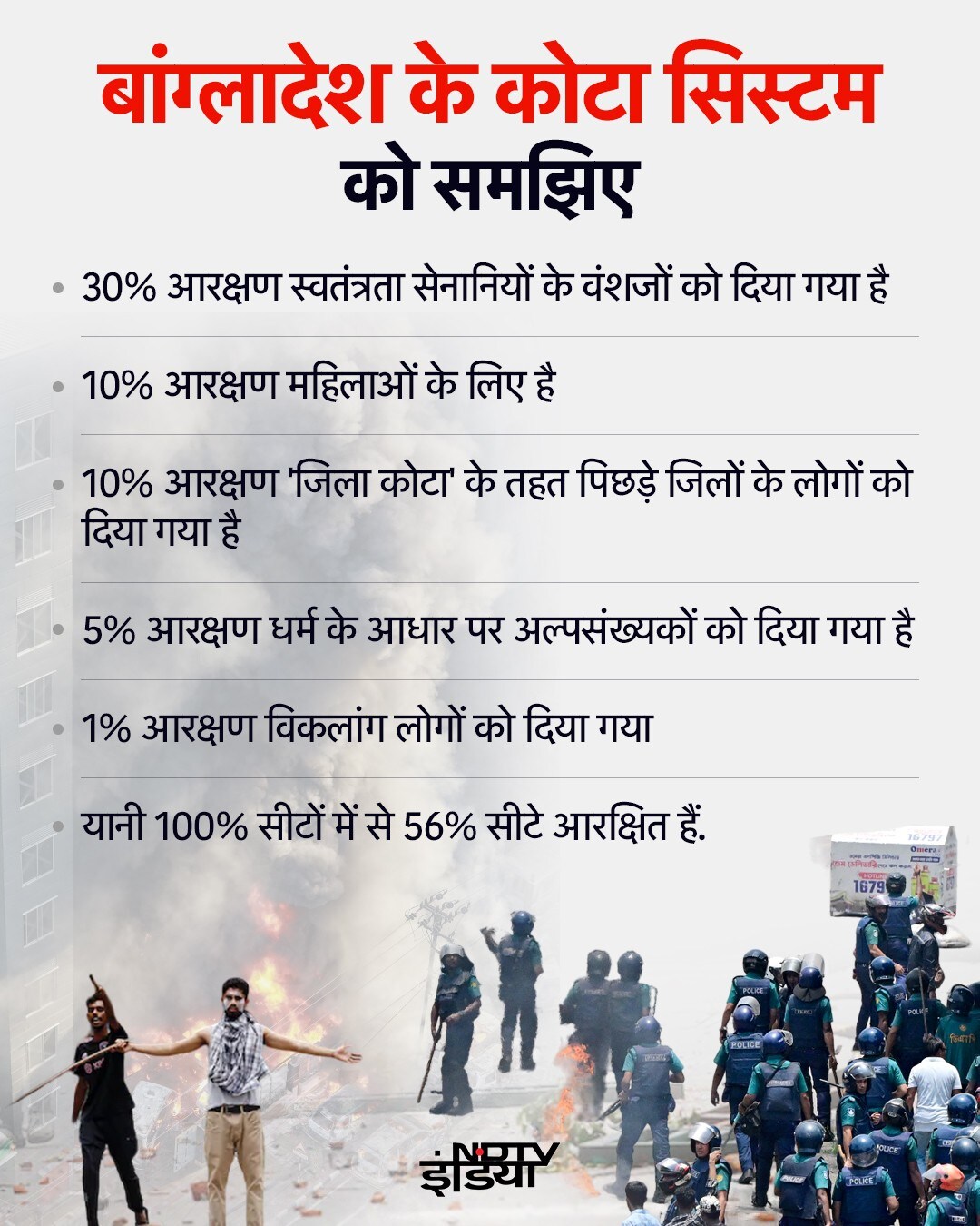 बांग्लादेश में प्रदर्शन और हिंसा की मुख्य वजह सरकारी नौकरी में आरक्षण की मांग और उसका विरोध करना है. प्रदर्शनकारियों का एक गुट चाहता है कि सरकारी नौकरी में 1971 में हुई आजादी की लड़ाई में शामिल लोगों के वंशजों को मिल रहे आरक्षण को जारी रखा जाए. जबकि एक धड़ा ऐसा है जो सरकारी नौकरी में इस तरह के आरक्षण को जारी रखने के खिलाफ है. उनका मानना है कि इस आरक्षण को खत्म कर देना चाहिए. इसी वजह से बांग्लादेश में लगातार हिंसा हो रही है.चलिए आज हम आपको बताते हैं कि आखिर बांग्लादेश में सरकारी नौकरी के तहत आरक्षण का ये पूरा गणित है क्या ?