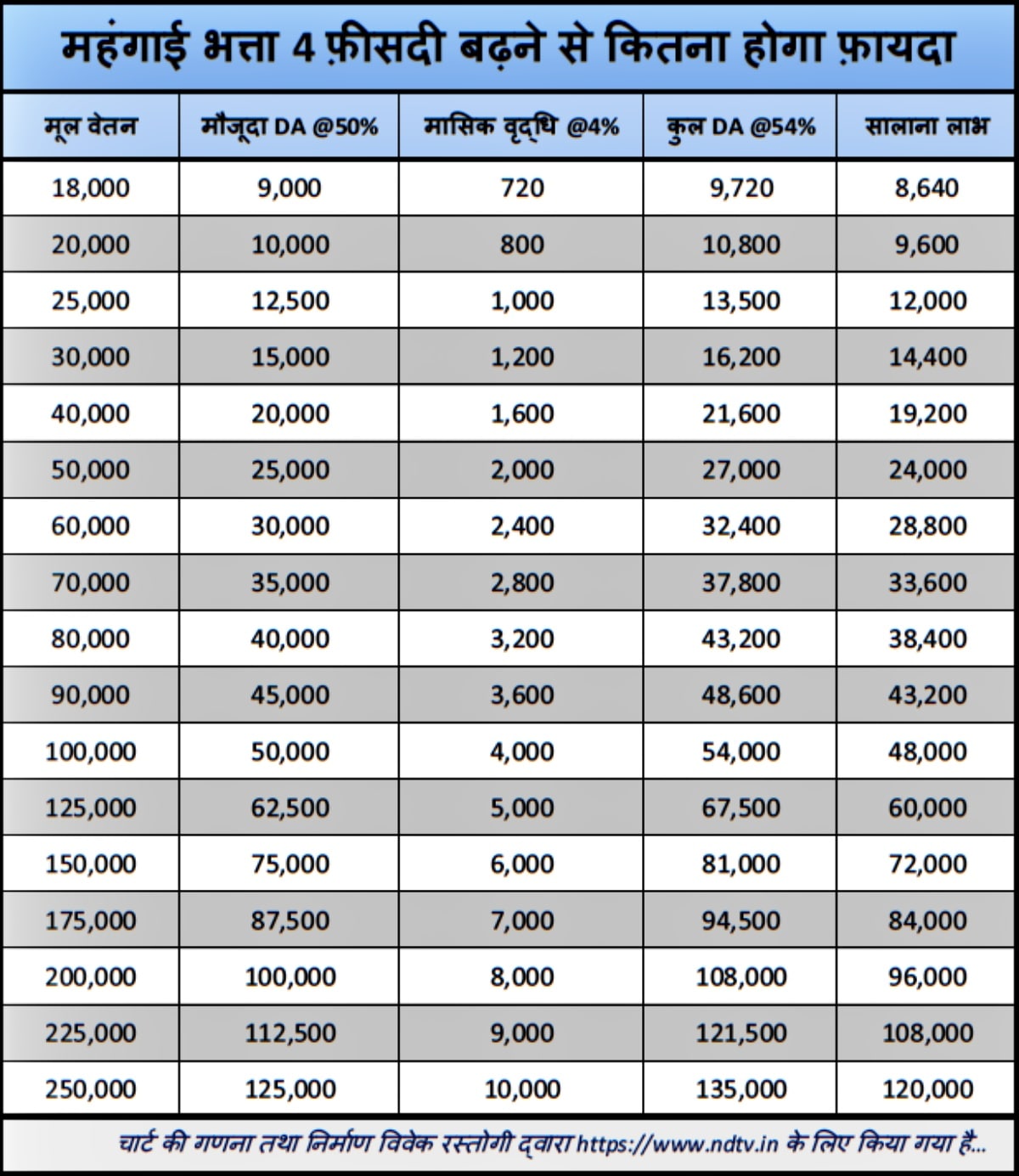 इसी तरह,बेसिक सैलरी ₹1,25,000 पाने वालों को हर माह ₹5,000 तथा हर साल ₹60,000 ज़्यादा हासिल होंगे,और जिनकी बेसिक सैलरी ₹1,50,उन्हें इस बढ़ोतरी के बाद हर महीने ₹6,000 तथा हर साल ₹72,000 का लाभ मिलेगा. ₹1,75,000 पाने वालों को हर माह ₹7,000 तथा हर साल ₹84,और जिनकी बेसिक सैलरी ₹2,उन्हें इस बढ़ोतरी के बाद हर महीने ₹8,000 तथा हर साल ₹96,000 का लाभ मिलेगा. जिन सरकारी अधिकारियों की बेसिक सैलरी ₹2,उन्हें 4 फ़ीसदी के DA Hike के चलते हर महीने ₹9,000 और हर साल ₹1,08,000 का फ़ायदा होगा. इसी तरह,₹2,000 बेसिक सैलरी वाले शीर्ष अधिकारियों को ₹10,000 मासिक और ₹1,20,000 का सालाना फ़ायदा हासिल होगा.