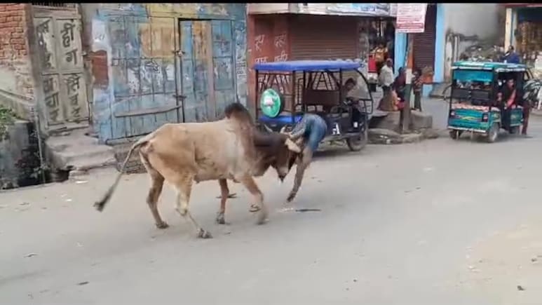 जलालाबाद में एक ट्रैफिक के बीच शख्स का पीछा करते हुए नजर आए. इसके बाद उसने शख्स को पीछे से मारा और शख्स जमीन पर गिर गया. इससे पहले वह उठ पाता,सांड ने उसे फिर से मार दिया. इससे वह उछल कर एक बार फिर जमीन पर गिर गया.