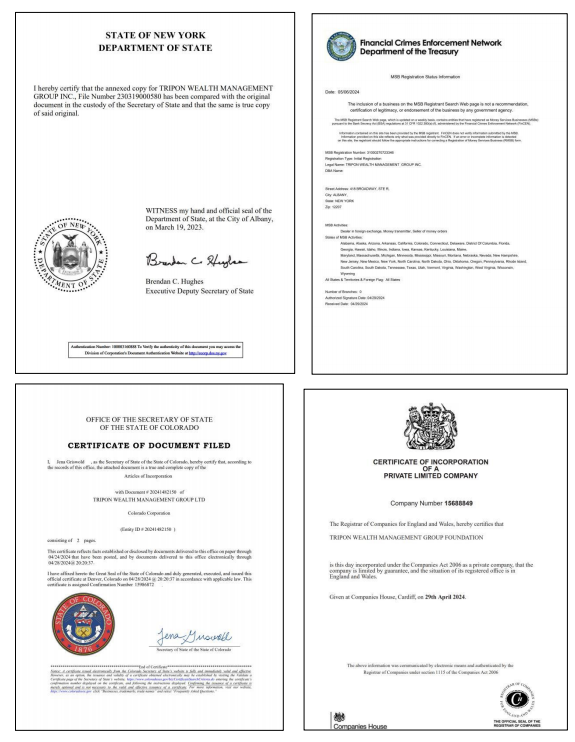 TRIPON की स्थापना 2023 में हुई और इसका मुख्यालय न्यूयॉर्क, यूएसए में है। हालाँकि इसे स्थापित हुए ज़्यादा समय नहीं हुआ है, लेकिन ट्रिपॉन अपनी बेहतरीन पेशेवर क्षमताओं और नवोन्मेषी भावना के साथ वैश्विक वेल्थ मैनेजमेंट क्षेत्र में तेज़ी से उभरा है। अपनी स्थापना के बाद से, कंपनी ने कई अंतरराष्ट्रीय अनुपालन योग्यताएँ और लाइसेंस प्राप्त किए हैं, जिनमें न्यूयॉर्क राज्य अनुपालन योग्यता, यूएस एनएफए वित्तीय लाइसेंस, यूएस एमएसबी वित्तीय लाइसेंस, यूएस कोलोराडो अनुपालन योग्यता, सिंगापुर फाउंडेशन लाइसेंस और ब्रिटिश फाउंडेशन लाइसेंस शामिल हैं।