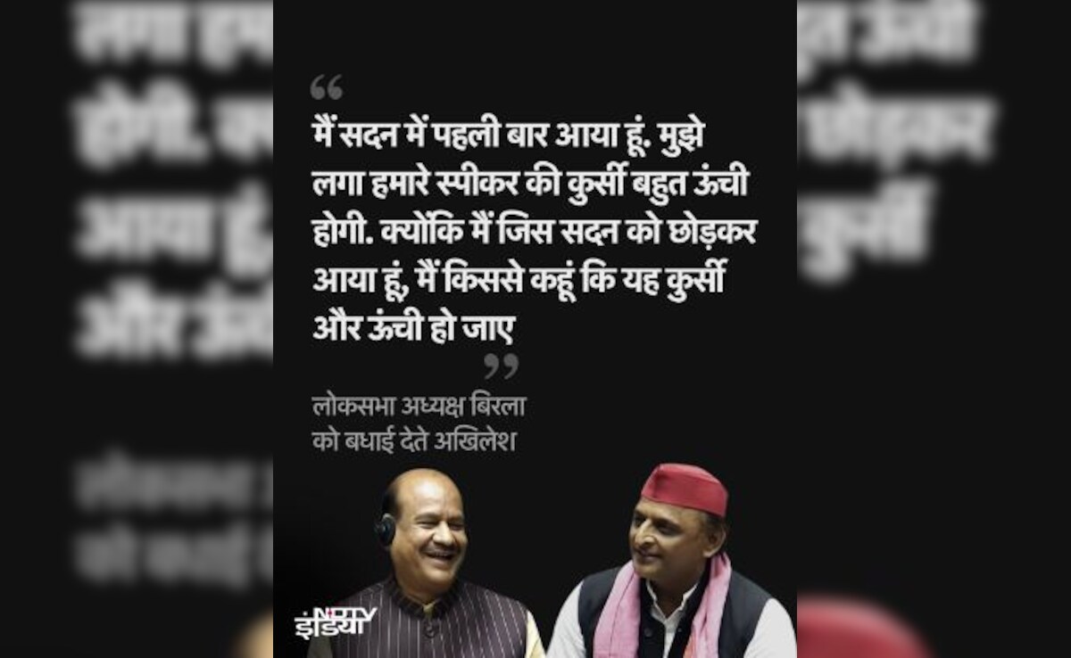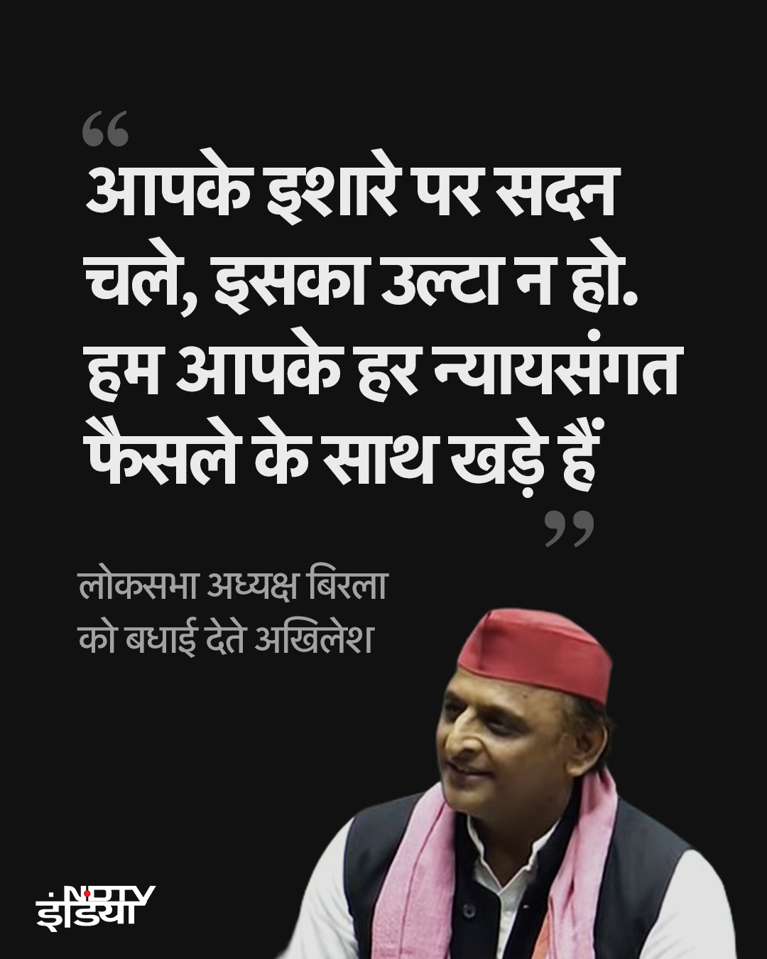 अखिलेश यादव ने ओम बिरला को बधाई देते इशारों ही इशारों में कई कटाक्ष भी किए. सपा मुखिया ने नए स्पीकर से कहा कि हम आपके सभी न्यायोचित निर्णयों के साथ खड़े रहेंगे और उम्मीद करते हैं कि केवल विपक्ष को ही नियंत्रण में नहीं रखा जाएगा.