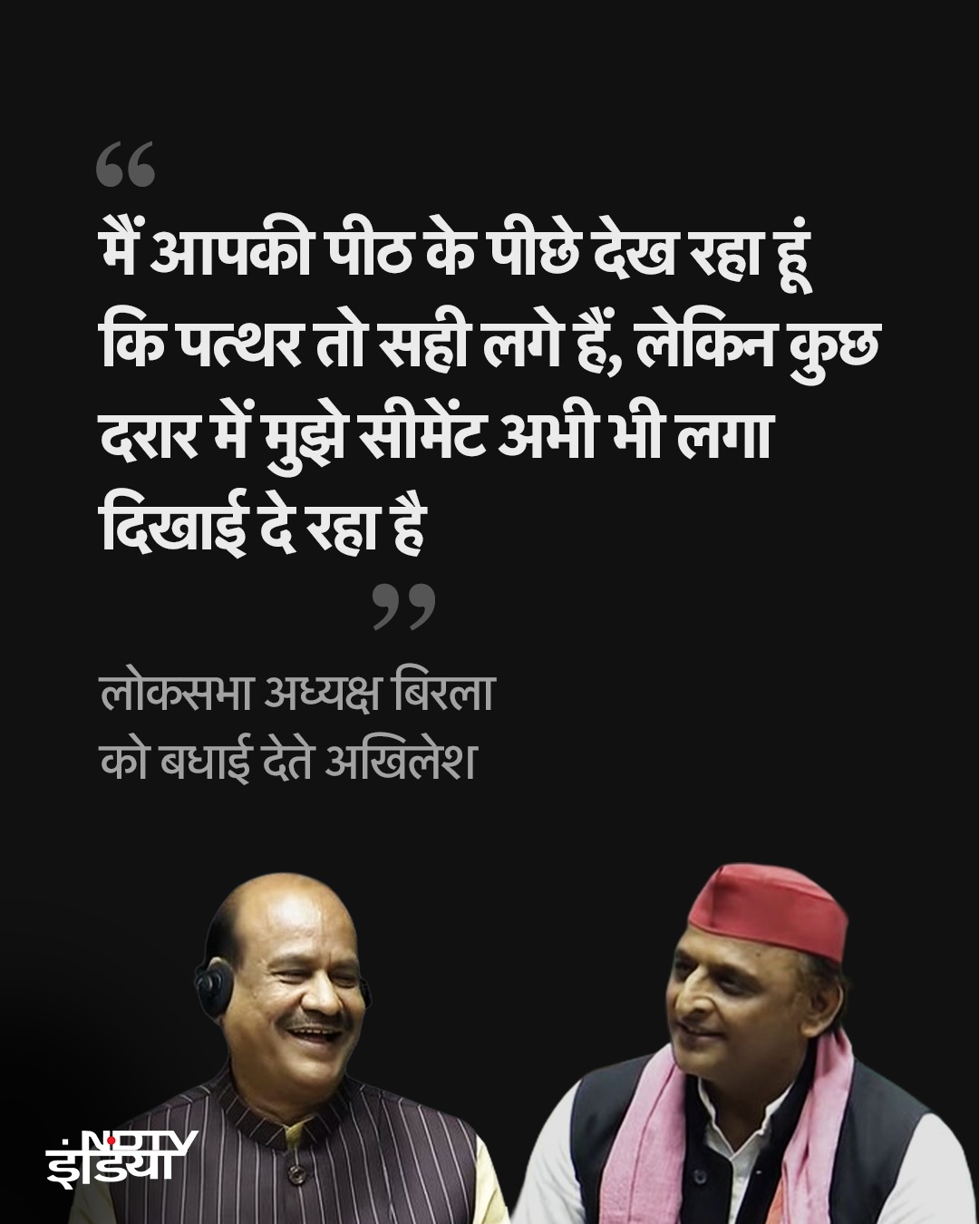लोकसभा अध्यक्ष बिरला को बधाई देते अखिलेश यादव ने कहा,"मैं आपकी पीठ के पीछे देख रहा हूं कि पत्थर तो सही लगे हैं,लेकिन कुछ दरार में मुझे सीमेंट अभी भी लगा दिखाई दे रहा है."