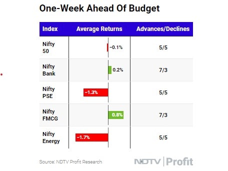 बजट से पहले के हफ्तों में,निफ्टी बैंक और निफ्टी FMCG इंडेक्स 0.17% और 0.79% की एवरेज ग्रोथ के साथ 10 में से 7 बार बढ़े हैं.