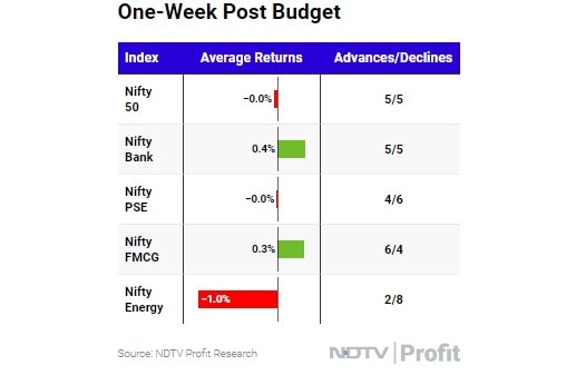 वहीं,बजट के बाद के सप्ताह में,निफ्टी एनर्जी इंडेक्स में सबसे मजबूत ट्रेंड्स देखा गया,जो 1.02% की एवरेज गिरावट के साथ 10 में से 8 बार गिरा है.