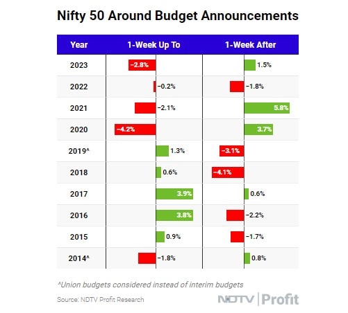 पिछले चार बजट में,घोषणा से पहले के सप्ताह के दौरान निफ्टी 50 में लगातार गिरावट आई है,जो 2014 से हर साल दर्ज की जाने वाली लगातार बढ़त के पिछले रुझान को पलट देता है. जबकि पिछले चार बजटों के बाद के सप्ताह में,निफ्टी में एक को छोड़कर सभी में बढ़ोतरी हुई.