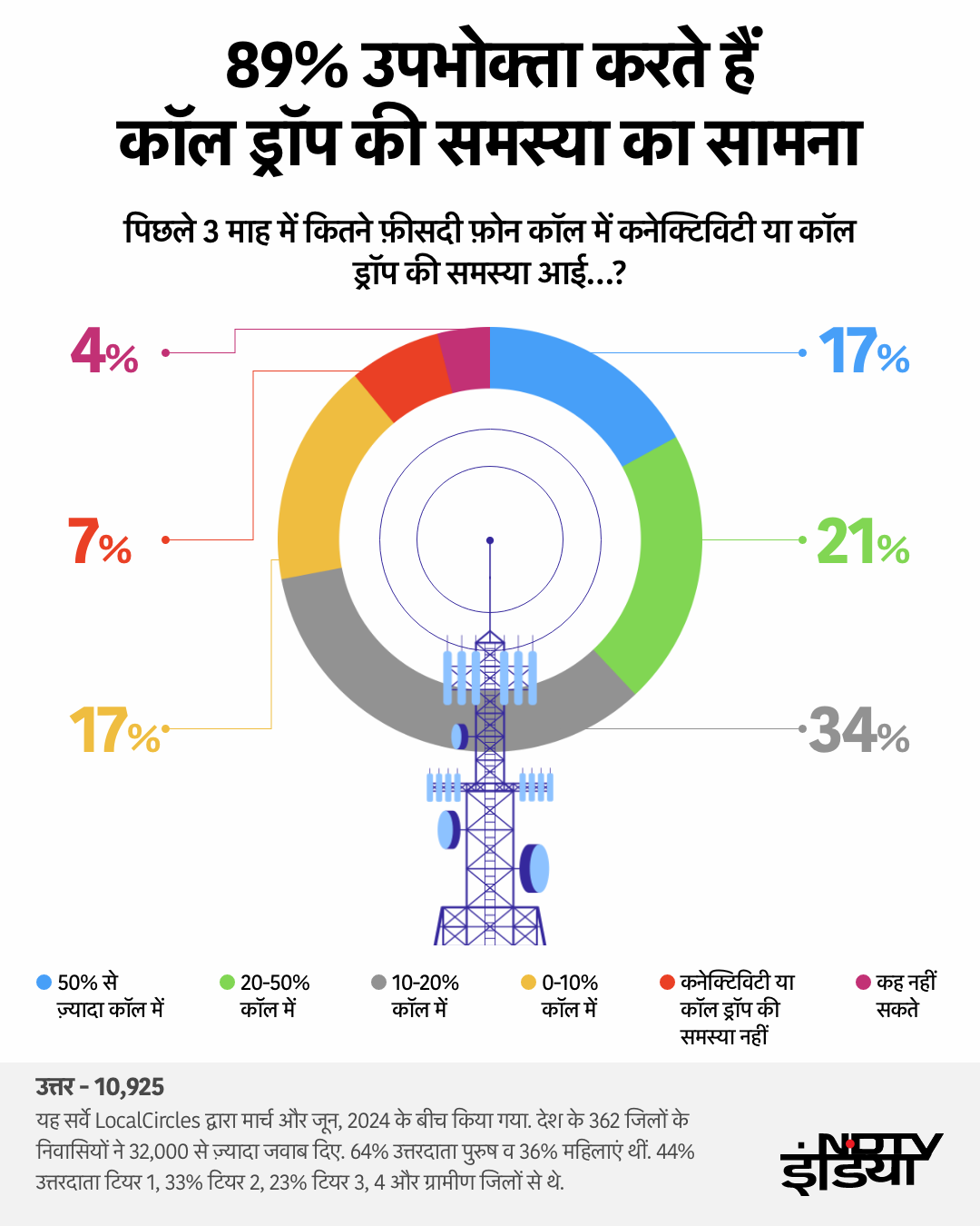 सोशल मीडिया पर मौजूद अलग-अलग रिपोर्टों के मुताबिक कॉल ड्रॉप और मोबाइल कनेक्टिविटी की दिक्कत सिर्फ़ ग्रामीण क्षेत्रों में ही नहीं,बड़े महानगरों में भी होती है. सर्वे में पूछे गए सवाल 'पिछले तीन माह के दौरान आपके कितनी प्रतिशत मोबाइल फ़ोन कॉल में कनेक्टिविटी या कॉल ड्रॉप की समस्या सामने आई है...?' का जवाब देने वाले 10,925 उपभोक्ताओं में से 17 फ़ीसदी ने 'आधी से ज़्यादा' उत्तर दिया. 21 फ़ीसदी उपभोक्ताओं ने उत्तर में '20-50 फ़ीसदी' को चुना तथा 34 फ़ीसदी ने '10-20 फ़ीसदी कॉल में' को जवाब चुना. 17 फ़ीसदी उत्तरदाताओं ने '0-10 फ़ीसदी कॉल' को अपना जवाब चुना,जबकि 7 फ़ीसदी उत्तरदाताओं के अनुसार,उन्हें किसी समस्या का सामना नहीं करना पड़ा. चार फ़ीसदी उत्तरदाताओं ने इस सवाल का जवाब दिया ही नहीं. कुल मिलाकर,इन आंकड़ों से ज़ाहिर है कि सर्वे में शामिल 89 फ़ीसदी उपभोक्ताओं को कॉल कनेक्टिविटी से जुड़ी दिक्कतों और कॉल ड्रॉप की समस्या का सामना करना पड़ा,और 38 फ़ीसदी उपभोक्ताओं को तो 20 फ़ीसदी से ज़्यादा कॉलों में ड्रॉप की समस्या का सामना करना पड़ा है.
