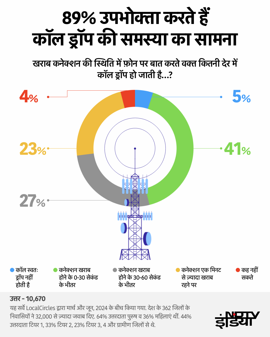 5-जी सेवाओं के बावजूद बेहतर और तेज़ कनेक्टिविटी का टेलीकॉम कंपनियों का वादा अभी तक पूरा नहीं हुआ है,लेकिन हाल ही में तीनों प्रमुख टेलीकॉम सर्विस प्रोवाइडरों ने अपने-अपने टैरिफ़ में बढ़ोतरी की है. दूरसंचार विभाग ने भी दो साल से ज़्यादा वक्त के बाद और 5-जी सेवाओं के लिए भारी निवेश किए होने का ज़िक्र करते हुए टैरिफ़ बढ़ाए जाने को जायज़ ठहराया है,लेकिन नेटवर्क की खराब क्वालिटी के बारे में उपभोक्ताएं की शिकायतें भी टैरिफ़ के अनुपात में बढ़ती जा रही हैं. मोबाइल सर्विस का हाल इतना खराब है कि लगभग 89 फ़ीसदी उपभोक्ताओं को कॉल कनेक्ट नहीं होने या कॉल कट जाने (कॉल ड्रॉप) जैसी समस्याओं का सामना करना पड़ रहा है.