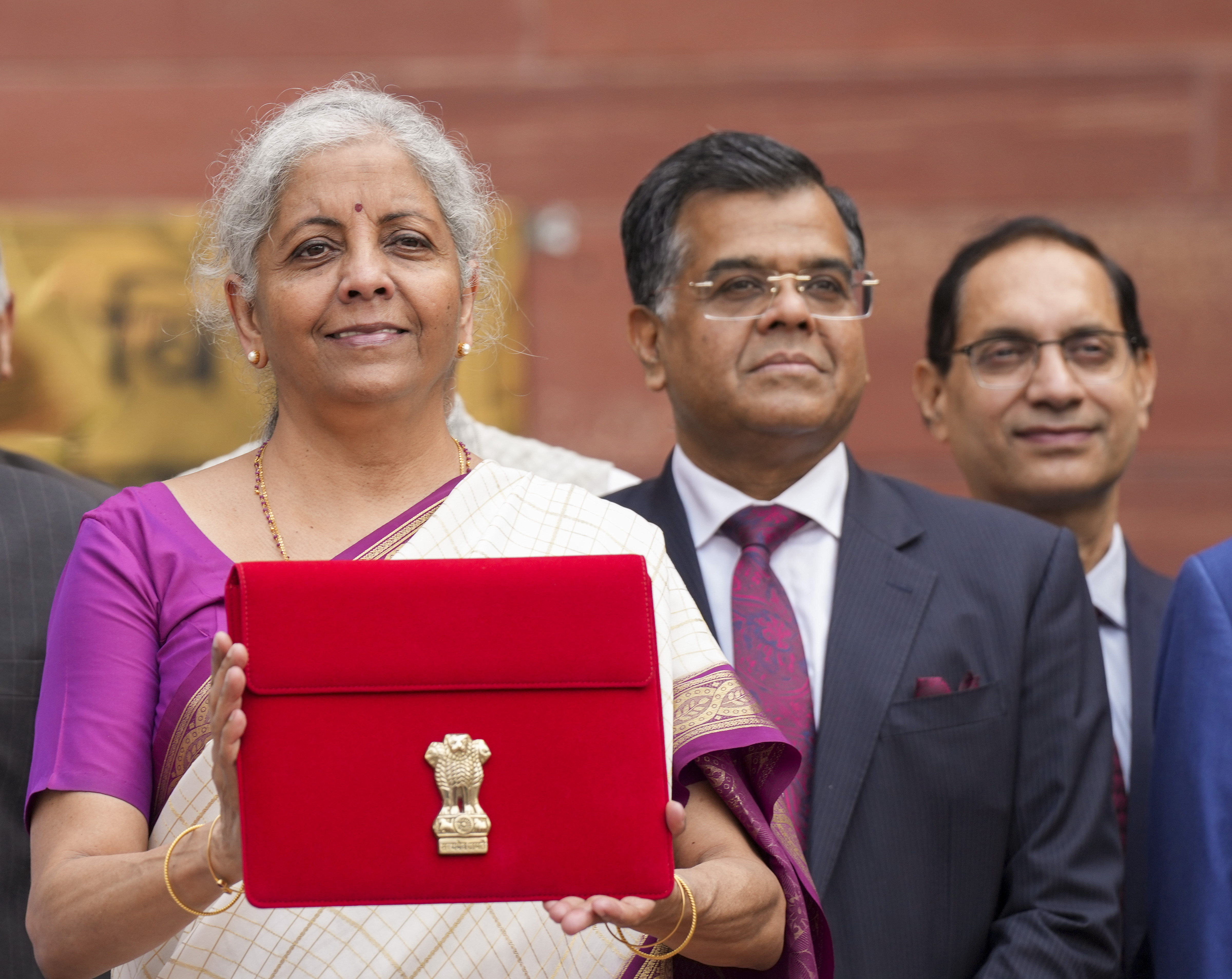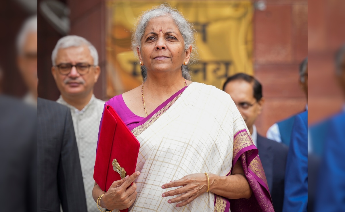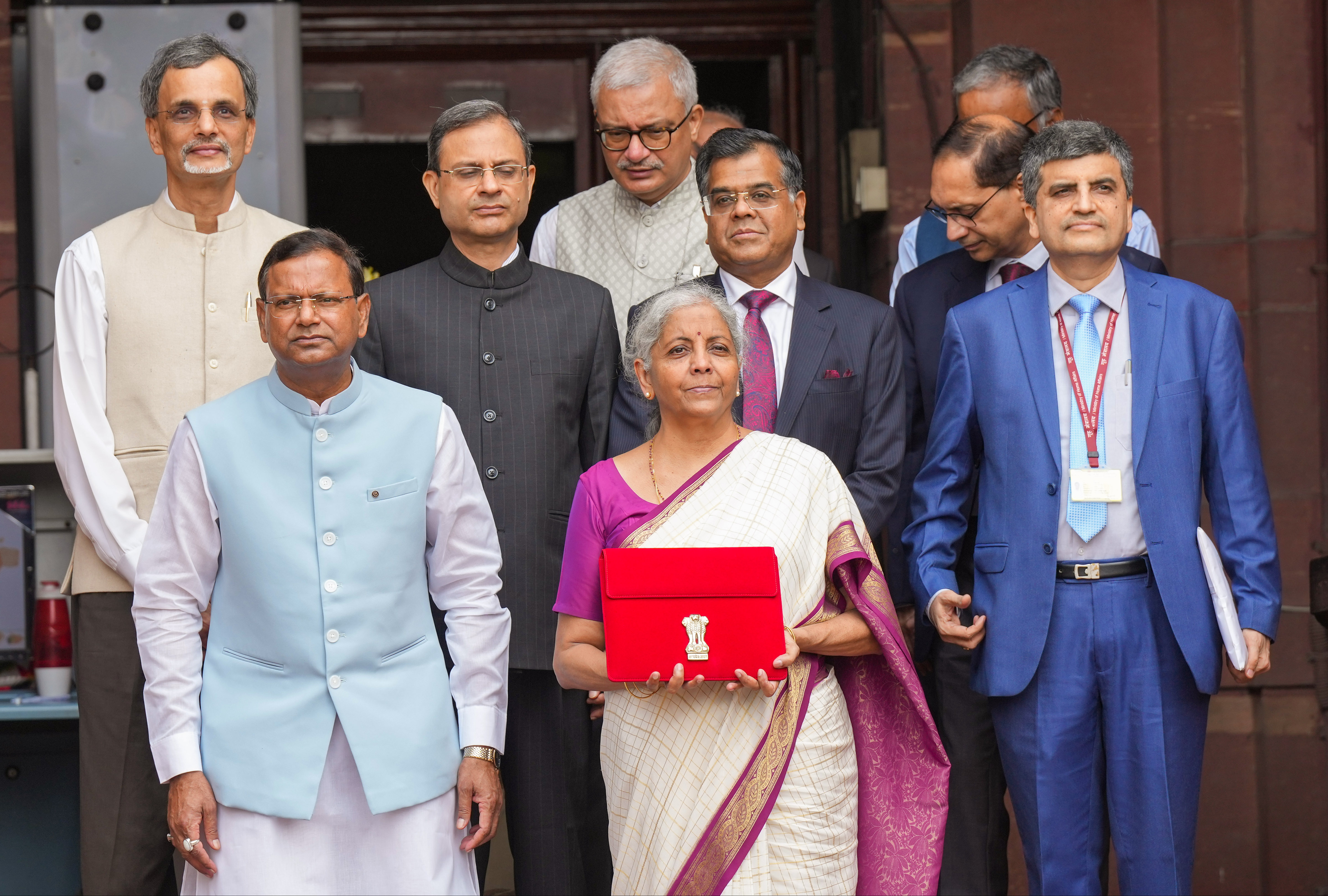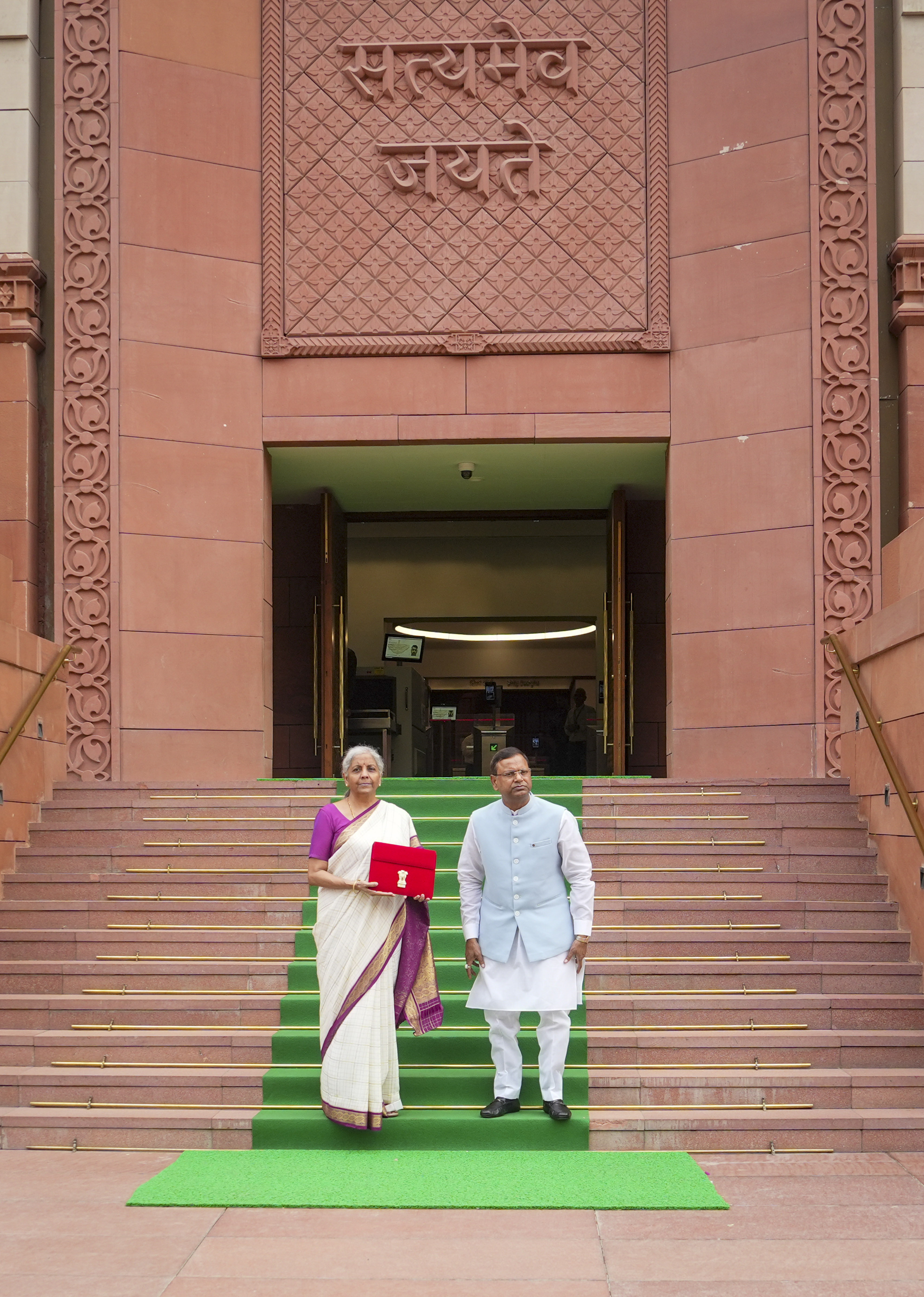 हाथ में बही खाता लिए वित्त मंत्री निर्मला सीतारमण वित्त राज्य मंत्री पंकज चौधरी के साथ संसद भवन पहुंचीं,थोड़ी देर में वह आम बजट पेश करेंगी.