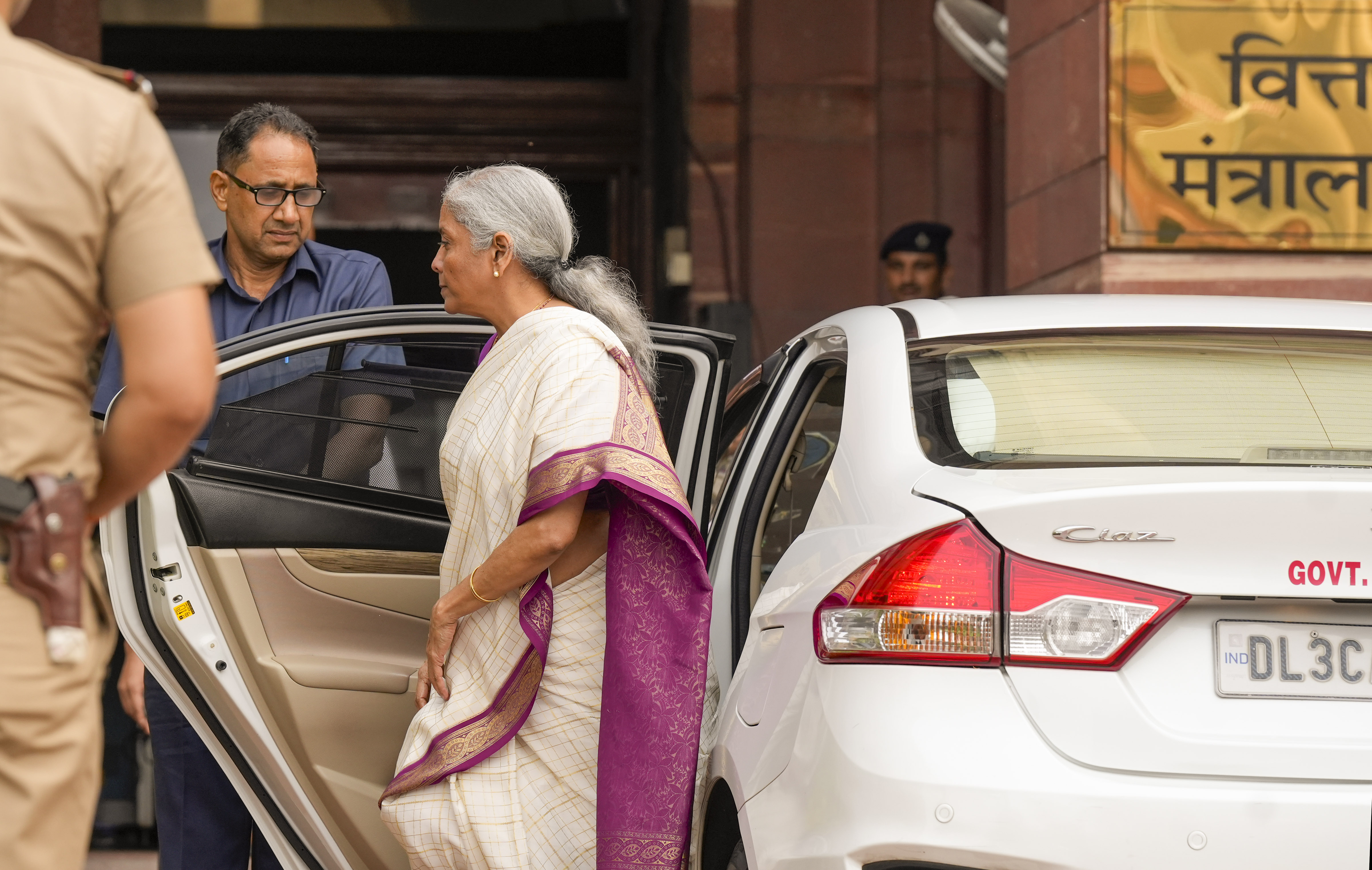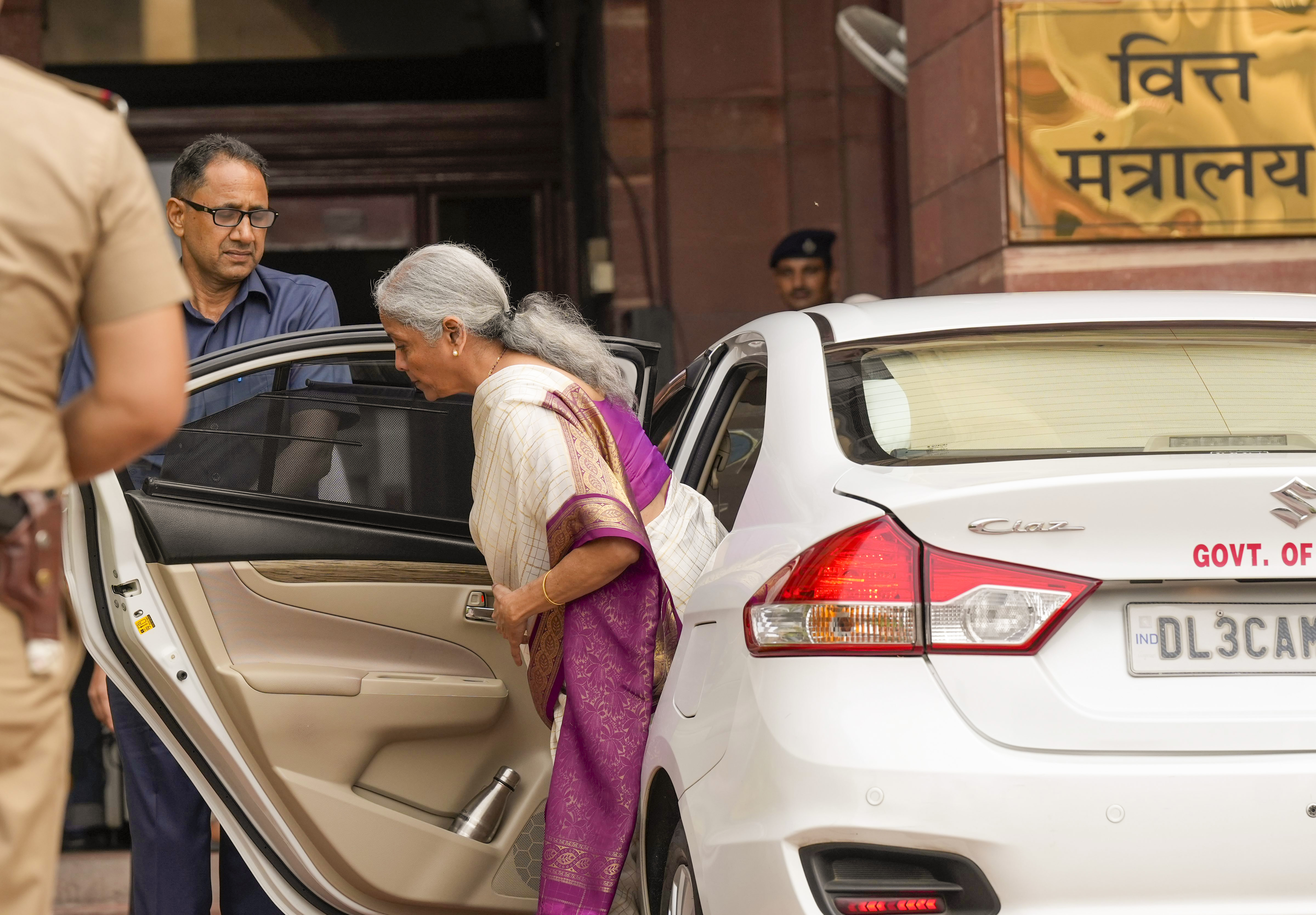 वित्त मंत्री निर्मला सीतारमण सफेद और मैजेंटा साड़ी में सुबह 8.35 बजे के करीब अपने घर से निकलकर वित्त मंत्रालय पहुंचीं.