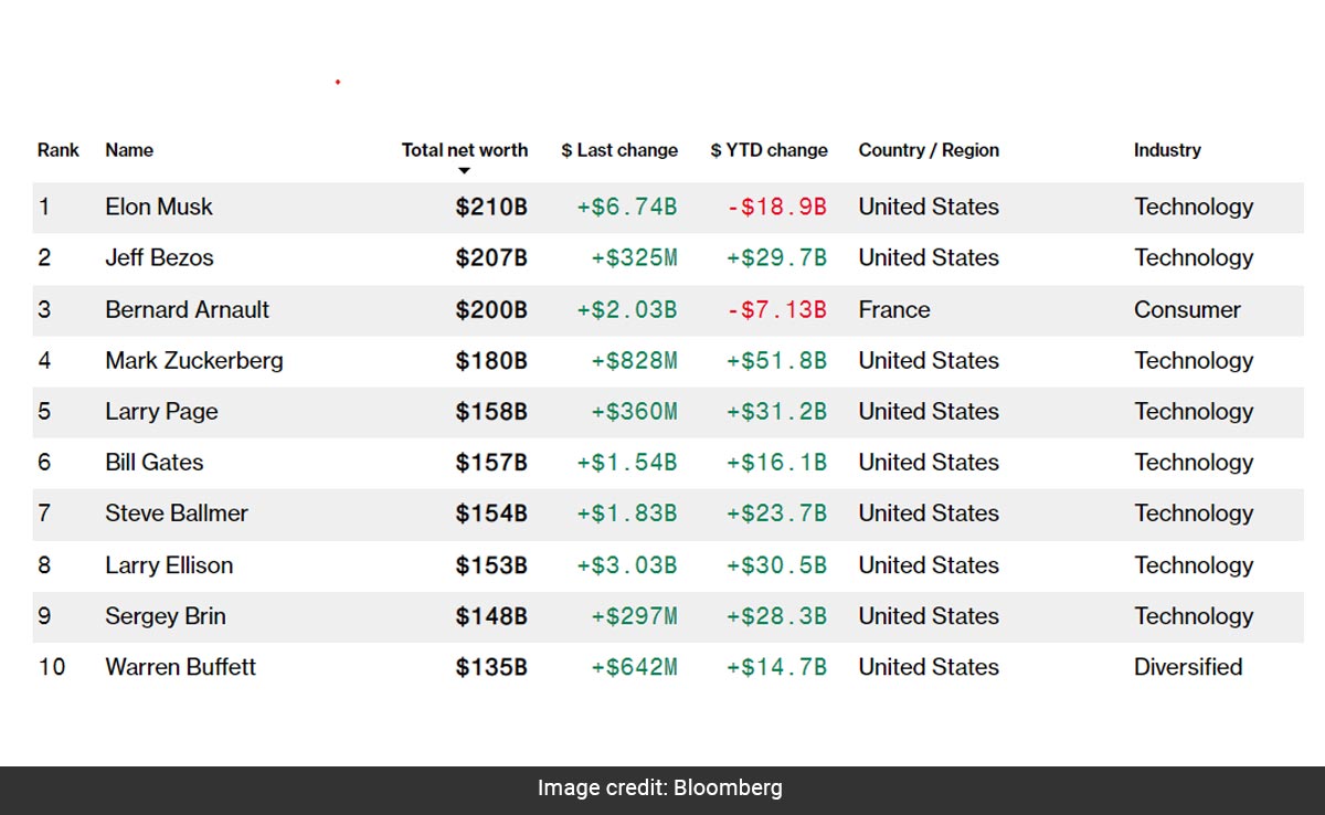 दुनिया के सबसे अमीर लोगों की लिस्ट में टॉप-10 में बर्नार्ड अर्नाल्ट,मार्क जुकरबर्ग,बिल गेट्स और वॉरेन बफेट जैसे दिग्गज शामिल हैं.