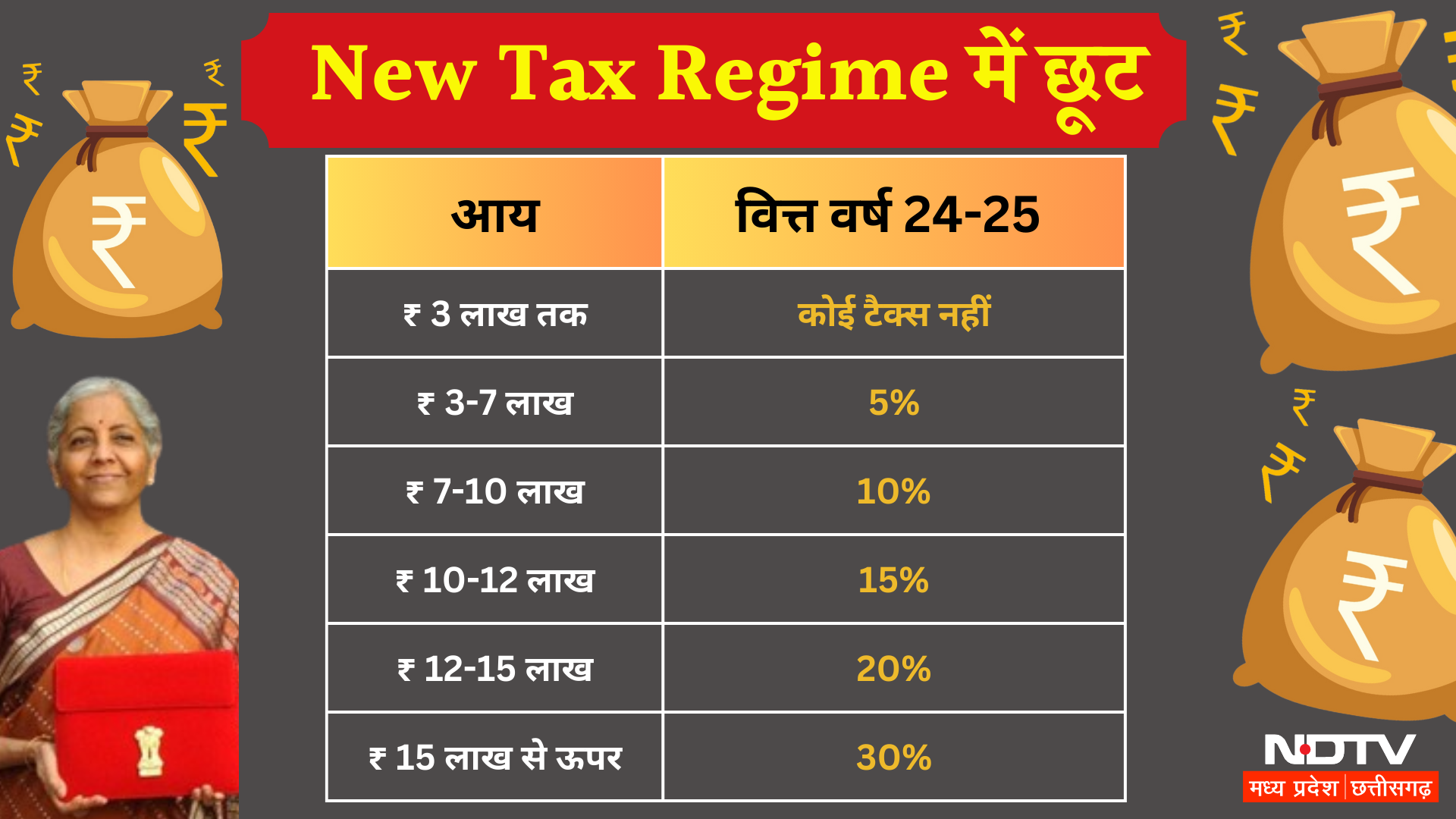 वित्त मंत्री ने करदाताओं को भी बजट में कुछ राहत देने की व्यवस्था की है. बजट में नई टैक्स व्यवस्था में मानक कटौती ₹50,000 से बढ़ाकर ₹75,000 की गई है. नई टैक्स व्यवस्था में इनकम टैक्स स्लैब में भी बदलाव किया गया है. नई टैक्स रिजीम में 3 लाख तक की आय वाले लोगों पर कोई कर नहीं लगेगा. 3 से 7 लाख तक की कमाई पर 5 प्रतिशत इनकम टैक्स देना होगा. 7 से 10 लाख की आय होने पर 10 फीसदी की दर से आय कर लगेगा. 10 से 12 लाख के टैक्सेबल इनकम पर 15 फीसदी की दर से आयकर लगेगा. 12 से 15 लाख के टैक्सेबल इनकम पर 20 फीसदी आयकर लगेगा. 15 लाख से ज्यादा के टैक्सेबल आय पर 30 फीसदी की दर से आयकर लगेगा. इसके साथ ही सरकार ने पेंशनभोगियों के लिए पारिवारिक पेंशन पर कर कटौती को 15,000 रुपये से बढ़ाकर 25,000 रुपये करने का प्रस्ताव किया है.