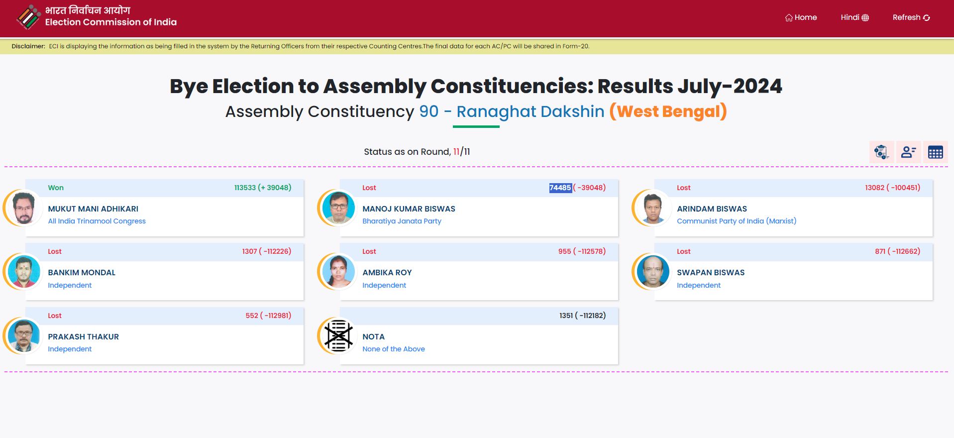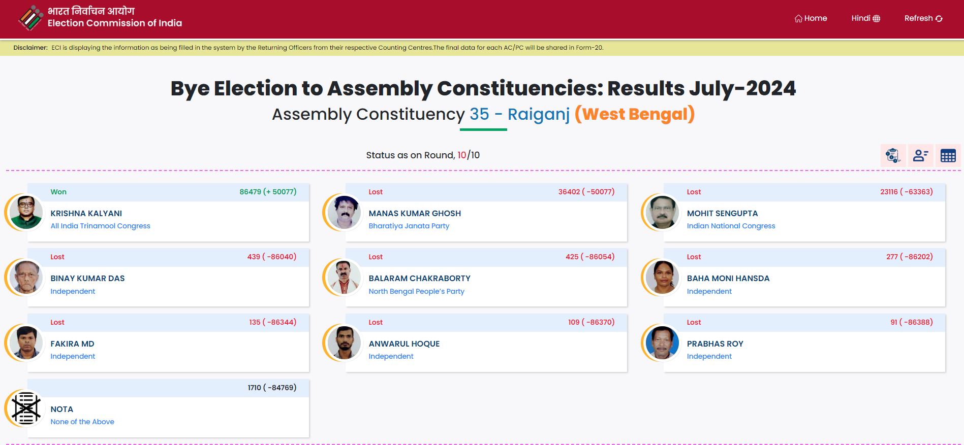 सत्तारूढ़ पार्टी ने रायगंज से कृष्णा कल्याणी को चुनावी मैदान में उतारा था. वहीं भाजपा ने इस सीट सेमानस कुमार घोष को टिकट दिया था.कृष्णा कल्याणी ने ये उपचुनाव 50077 वोटों से जीता है. उन्हें कुल86479 वोट डले. वहीं बीजेपी उम्मीदवार के खाते में36402 वोट आए.