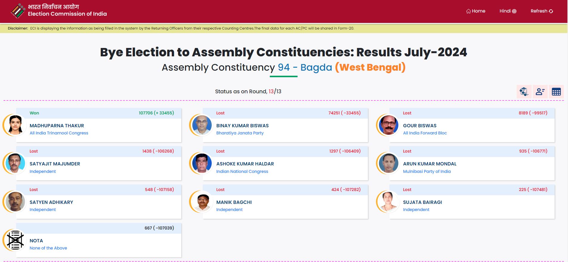 उम्मीदवारपार्टीरूझानअशोक कुमार हलधरकांग्रेसपीछेबिनय कुमार बिस्वासभाजपापीछेमधुपर्णा ठाकुरटीएमसीजीती