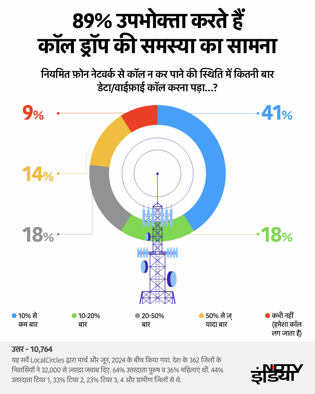 LocalCircles के सर्वे में शामिल लोगों में से 89% ने बताया कि उन्हें पिछले 3 महीनों में फोन कॉल कनेक्ट न होने या कॉल कट जाने की समस्या का सामना करना पड़ा है. 38% लोगों को तो 20% से ज्यादा कॉल में ये दिक्कतें आई हैं. जिसकी वजह से हर 3 में से 1 यूजर वाईफाई कॉल पर शिफ्ट हो गया है.सर्वे में यह भी पाया गया कि सिर्फ गांवों में ही नहीं बल्कि बड़े शहरों में भी कॉल ड्रॉप और मोबाइल कनेक्शन की समस्या आम है.