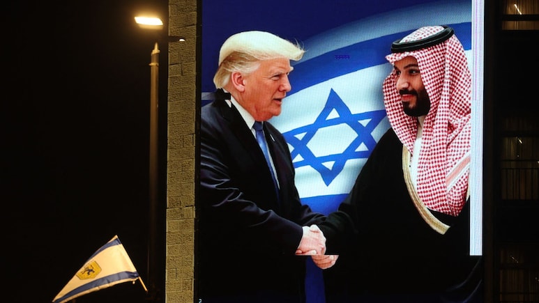 एक बिलबोर्ड पर अमेरिकी राष्ट्रपति डोनाल्ड ट्रंप और सऊदी क्राउन प्रिंस मोहम्मद बिन सलमान हाथ मिलाते हुए