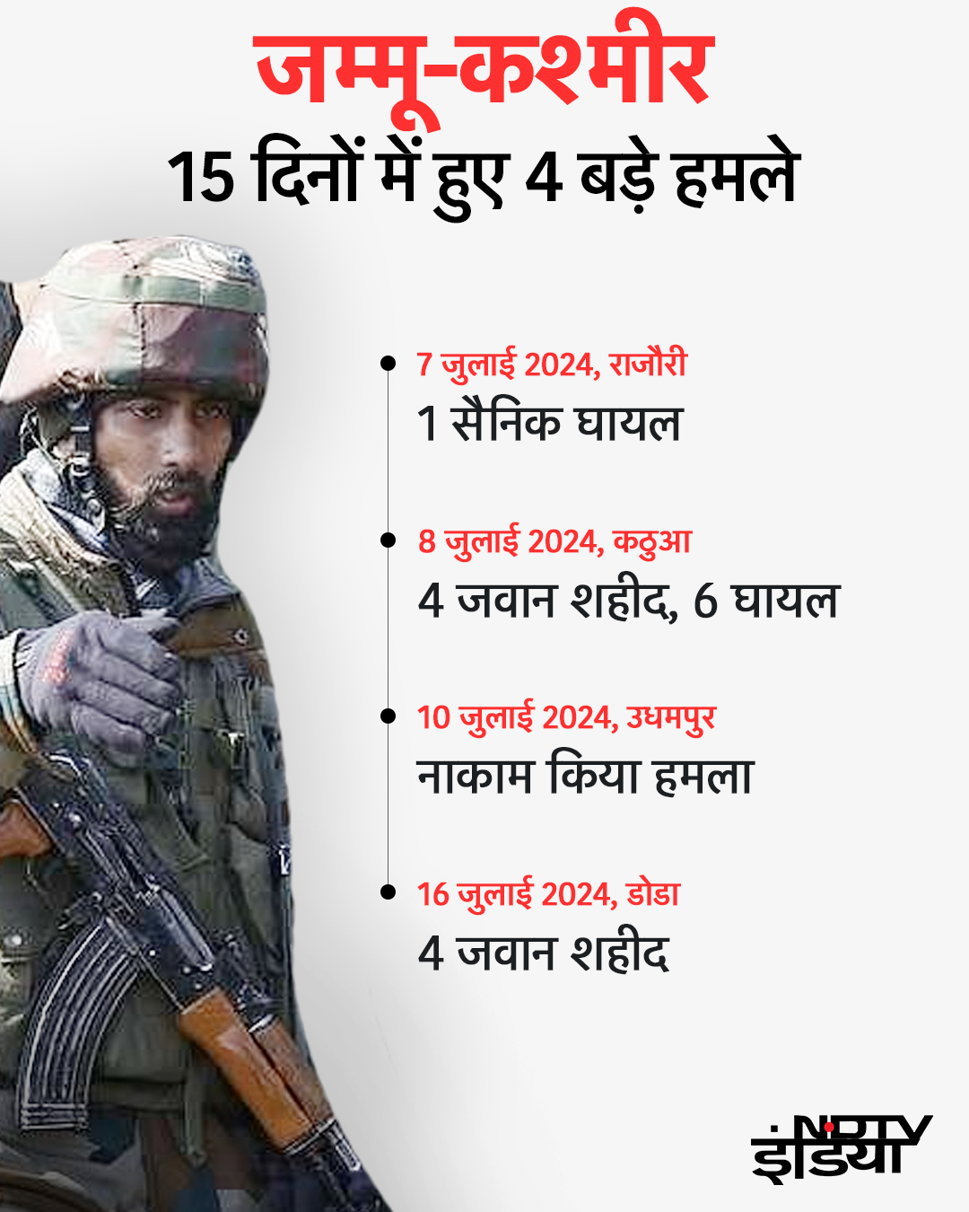 Jammu and Kashmir terrorist attacks: जम्मू-कश्मीर में भारतीय सेना पर हाल ही के दिनों में एक के बाद एक कई सारे आतंकी हमले हुए हैं. महज 15 दिनों में घाटी 4 बड़े आतंकी हमलों से दहल गई है. इन हमलों में सेना के कई जवान शहीद हुए हैं और कई घायल. आतंकवादियों को पकड़ने के लिए सेना कई सारे सर्च ऑपरेशन भी कर रही है. इतना ही नहीं रविवार को भारतीय सेना ने जम्मू-कश्मीर के कुपवाड़ा जिले के केरन सेक्टर में नियंत्रण रेखा (एलओसी) पर घुसपैठ विरोधी अभियान में तीन आतंकवादियों को मार गिराया था. लेकिन फिर भी आतंकवादी हमले तेजी से बढ़ रहे हैं.