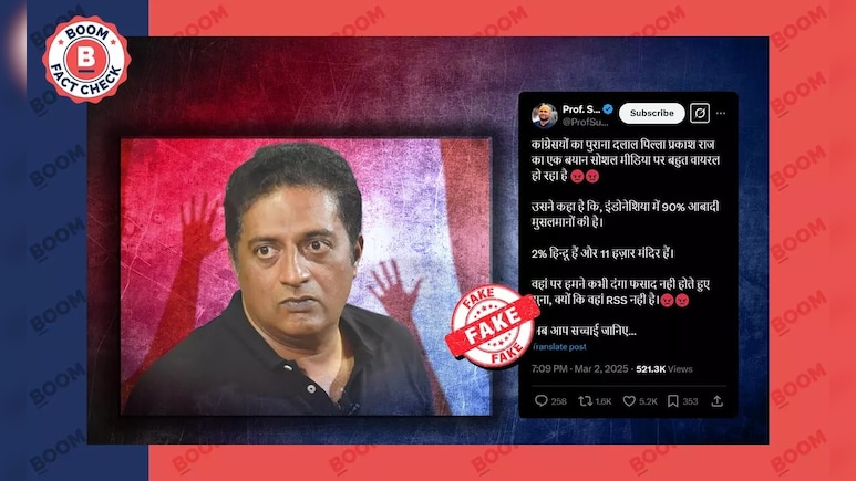 अभिनेता प्रकाश राज का एक कथित बयान सोशल मीडिया पर वायरल हो रहा है. इस बयान में प्रकाश राज के हवाले से कहा गया कि मुस्लिम बहुल देश इंडोनेशिया में सांप्रदायिक सौहार्द इसलिए है क्योंकि वहां राष्ट्रीय स्वयंसेवक संघ (आरएसएस) नहीं है. बूम ने पाया कि वायरल बयान फर्जी है. प्रकाश राज ने खुद एक पोस्ट के जरिए इसका खंडन किया था. एक्स पर दक्षिणपंथी यूजर प्रोफेसर सुधांशु ने प्रकाश राज की एक तस्वीर को शेयर करते हुए लिखा,'कांग्रेसियों का पुराना दलाल *** प्रकाश राज का एक बयान सोशल मीडिया पर बहुत वायरल हो रहा है. उसने कहा है कि इंडोनेशिया में 90% आबादी मुसलमानों की है. 2% हिन्दू हैं और 11 हजार मंदिर हैं. वहां पर हमने कभी दंगा-फसाद नहीं होते हुए सुना,क्योंकि वहां RSS नहीं है.'