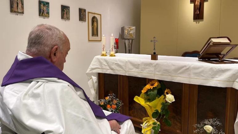 फोटो में पोप बिना सिर पर कुछ पहने,व्हीलचेयर पर बैठे और सफेद कपड़ा और बैंगनी शॉल पहने हुए नजार आ रहे हैं. पोप फ्रांसिस के दाहिनी ओर से ली गई तस्वीर में उसका चेहरा पूरी तरह से दिखाई नहीं दे रहा है. नीचे की ओर देखती उनकी आंखें खुली हुई हैं.वेटिकन प्रेस ऑफिस ने इस तस्वीर के कैप्शन में लिखा: "आज सुबह,पोप फ्रांसिस ने जेमेली पॉलीक्लिनिक की 10वीं मंजिल पर अपार्टमेंट के चैपल में होली मास का आयोजन किया."