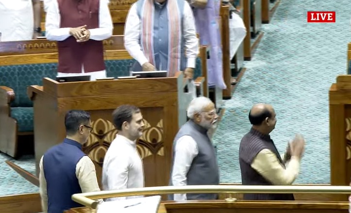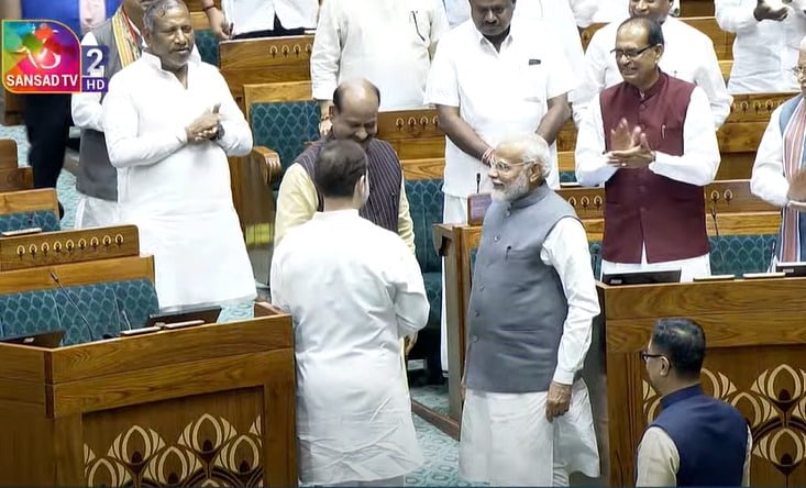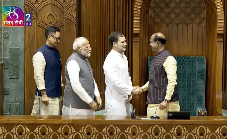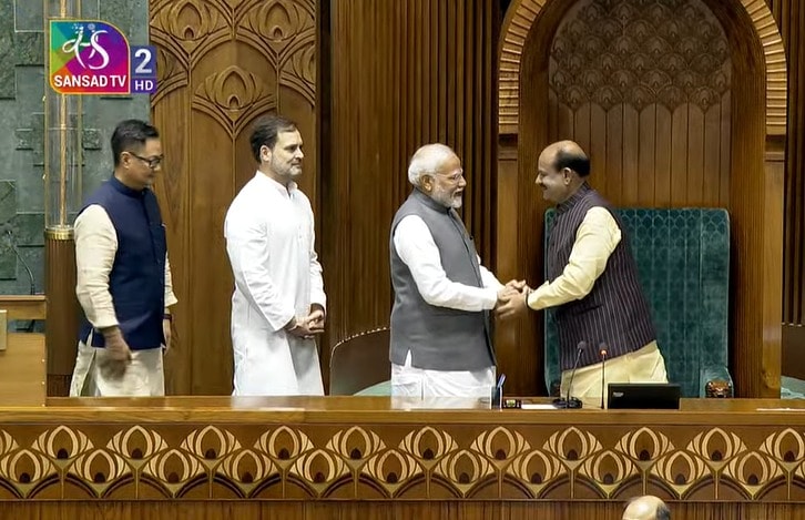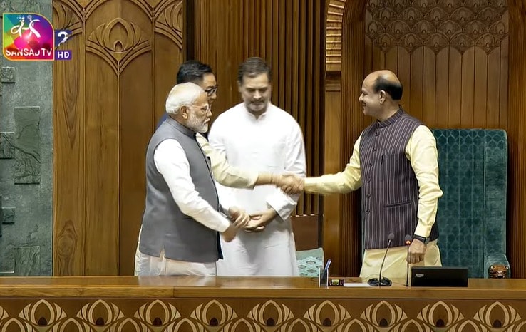 पीएम मोदी और राहुल गांधी ने हाथ मिलाया और फिर लोकसभा के सांसद ओम बिरला को अध्यक्ष के आसन तक लेकर गए. यहां पहुंचने के बाद पीएम मोदी और राहुल गांधी ने फिर एक बार ओम बिरला को अध्यक्ष चुने जाने को लेकर बधाई दी और हाथ मिलाया.