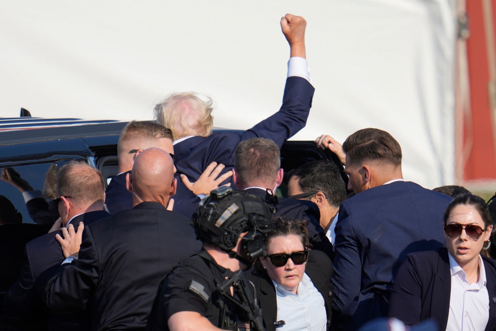 रैली के दौरान जैसे ही ट्रंप को गोली लगी तो सीक्रेट सर्विस के अधिकारियों ने सुरक्षा के लिए उन्हें चारो ओर से घेर लिया,हालांकि अधिकारियों के साथ जाते समय ट्रंप ने ऑडियो फीड के जरिए अपने समर्थकों से कुछ कहा.