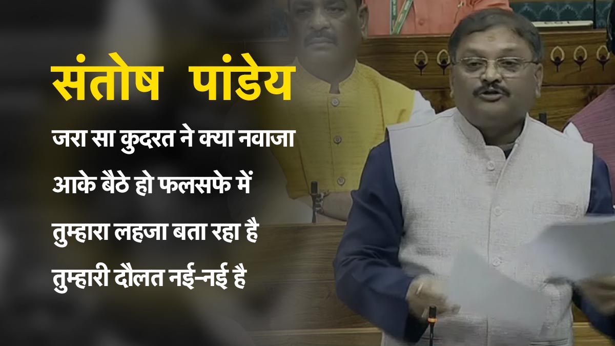 सपा सांसद अखिलेश यादव आज लोकसभा में एक खास अंदाज में दिखाई दिए. उन्होंने मोदी सरकार पर शायराना अंदाज में हमला किया और चुनावों में सीटें कम होने और बहुमत की सरकार ना बनने पर तंज कसा. उन्होंने कहा कि आवाम ने तोड़ दिया हुकूमत का गुरूर,दरबार तो लगा है पर,बड़ा गमगीन-बेनूर है,क्यों ऊपर से जुड़ा कोई तार नहीं,नीचे से कोई आधार नहीं,ऊपर से जो है अटकी हुई,यह कोई सरकार नहीं. यही नहीं अखिलेश यादव ने जोर देकर ये भी कहा कि ये चलने वाली नहीं,हारी हुई सरकार है. अखिलेश के भाषण के बाद छत्तीसगढ़ के राजनांदगांव से बीजेपी सांसद संतोष पांडेय ने अखिलेश यादव का जवाब उसी तरह शायराना अंदाज में पलटवार किया. संतोष पांडेय ने अखिलेश यादव का पर तंज कसते हुए कहा- जरा सा कुदरत ने क्या नवाजा,आके बैठे हो फलसफे में,तुम्हारा लहजा बता रहा है. तुम्हारी दौलत नई-नई है...