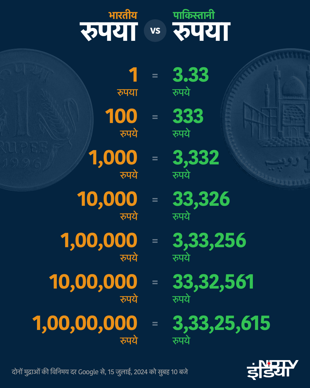 फ़ॉरेक्स बाज़ार के मुताबिक,सोमवार को एक भारतीय रुपया लगभग 3.33 पाकिस्तानी रुपये के बराबर है...