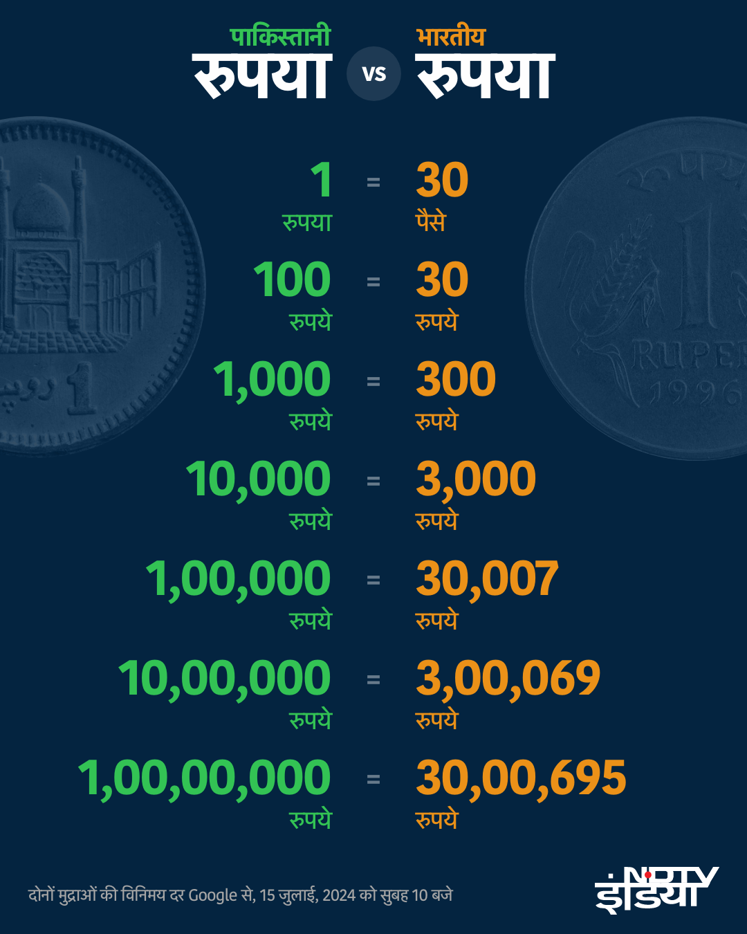 इसी तरह,अगर 100 भारतीय रुपये लेकर कोई पाकिस्तान जाता है,तो वहां उसी रकम से वह 333 पाकिस्तानी रुपये का सामान खरीद सकता है,या 100 पाकिस्तानी रुपये में बिक रही किसी वस्तु को सिर्फ़ 30 भारतीय रुपये में हासिल कर सकता है. बिल्कुल इसी तरह,1,000 भारतीय रुपये के बदले 3,332 पाकिस्तानी रुपये हासिल किए जा सकते हैं,या 1,000 पाकिस्तानी रुपये पाने के लिए सिर्फ़ 300 भारतीय रुपये खर्च करने होंगे.